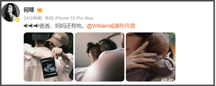 陈伟霆与何穗恋情分分合合传了有6年多,无论被拍到多少次同框,但两人从未回应过恋情相关,就连何穗被曝怀孕生子也无任何表态。如今突然官宣生子还是给人带来了很大的震撼,从晒出的孕期合照来看,两人感情相当好,脸贴脸拍大肚照搞怪有趣。