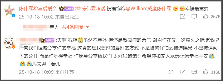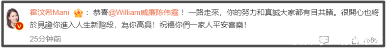两人官宣后,圈内好友也发文送出祝福,基本都是男方这边的。经纪人霍汶希艾特表示陈伟霆一路走来的努力都有目共睹,开心见证陈伟霆步入了人生新阶段,祝陈伟霆一家人平安喜乐,可以说是相当真诚的祝福了。